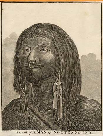 Upon seeing Cook's ship, the Nootka Chief Maquinna told his people "to go out and try to understand what these people wanted and what they are after." On that day Cook wrote in his log: "A great many canoes filled with the Natives were about the ships all day, and a trade commenced betwixt us and them, which was carried on with the Strictest honisty on boath sides. Their articles were the Skins of various animals, such as Bears, Wolfs, Foxes, Dear, Rackoons, Polecats, Martins and in particular the Sea Beaver, the same as is found on the coast of Kamtchatka." Captain Cook went on to the South Pacific, where he was killed when his presence roiled up the natives in Hawaii. The images of Vancouver Island's aboriginal inhabitants were published in the 1780s. They are featured below. |