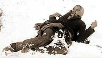 Not even women and children were safe from the avenging wrath of invading racist settlers, genocidal local militiamen - like Col. Chivington of Colorado, who carried out the Sand Creek Massacre - and the heartless steamroller of the United States Army and its ruthless generals like Custer and Sheridan. No wonder American Indians sought a kinder, gentler place of refuge, Canada... Sadly, sometimes they weren't even safe there. The Cyprus Hills Massacre in 1873 was carried out by American wolfers who crossed the border to kill dozens of Indian men, women, and children, before scurrying back across to the US and safety... Canadian police tried to bring them to justice in Canada but were stymied by US officials. This US depredation actually motivated the Canadian Government to form the North West Mounted Police to patrol the area, and prevent future massacres, which though commonplace in the US, it did not want in Canada. Left and below disarmed Sioux men, women, and children lie frozen, shot to death, amid the ruins of their tent camp at Wounded Knee. |