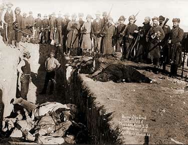 Trophy pictures of the victorious South Dakotan settlers, militiamen, and US Army soldiers piling the corpses of entire families into mass graves. Their descendants would pose for their own trophy pictures, a century later, at Abu Ghraib, in Iraq. |
