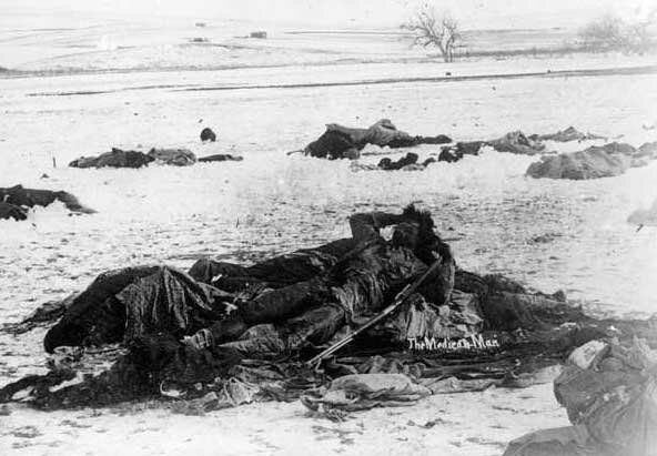 Almost from the beginning native people have been seen - at best - as a great inconvenience to Americans in their drive to create living space for white people. Today's American folk heroes, like Daniel Boone and Davy Crockett, were actually frontiersmen who fought Indians so they could steal their land and bring white settlers into Kentucky in the early 19th century. The success of this policy to wipe out the Indian was reflected in the literature of the time; an American classic "The Last of the Mohicans" could very well stand for the aim of the government's Indian policy of the time. It mirrored the quintessential American approach to the "noble Red Man" during the "building of America" from 1600 to 1900 - kill them wherever they got in the way of white development, then write about them, name rivers, towns, and counties after them. And celebrate - their passing... When small time private groups like those of Boone couldn't manage it, the American Army was used to do the job and teach the "noble Red Man" his place in the American scheme of things. Thousands of men, women, and children, were routinely massacred to make way for development. As late as December, 1890, the American Army used a machine gun to massacre some 300 helpless and freezing men, women, and children in the winter snows of Wounded Knee in South Dakota. Below the peaceful Chief Bigfoot shot and frozen.