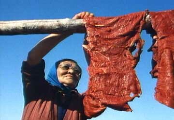 ![]() At Tulita (Fort Norman) the clear water of the Great Bear River flows into the mighty Mackenzie. The airstrip behind the town is the only way to get to the outside world. ![]() Mary Wilson making dried meat at Rat River, as it has been done for thousands of years, in this most remote part of Canada |