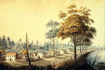 ![]() Until 1834, the city of Toronto was known as York or Hogtown, when painted by Elizabeth Hale in 1804. Today it is Canada's biggest city. The land was owned by the Mississauga Indians. In their honour the nearby city of Mississauga commemorates the memory of the original landowners. |